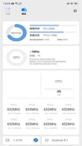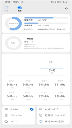 概览模块:可实时查看手机关键信息,包括物理内存、CPU运行状态、电量、温度、设备型号、开机时长。