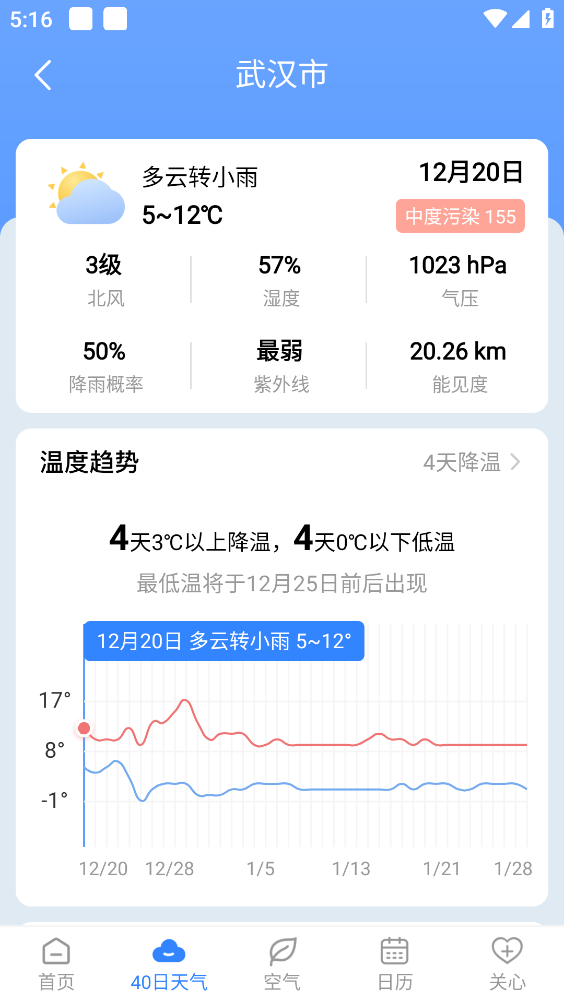 5、如图,完成添加后在首页就可以看到该城市的天气预报。