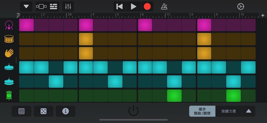 3、架子鼓模拟器将鼓组直观地展现在屏幕上,用户可以用多个手指同时敲击不同的鼓和镲片,获得反馈。