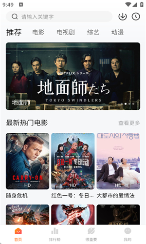 打开app后进入首页,顶部栏汇集电影、电视剧、综艺、动漫、纪录片等全品类资源,覆盖国内外热门及经典作品。