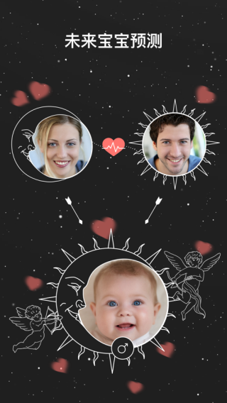 3.长相预测模块,支持父母照片合成宝宝长相、预测未来20至60年自身模样,可选择宝宝性别,满足探索好奇心。
