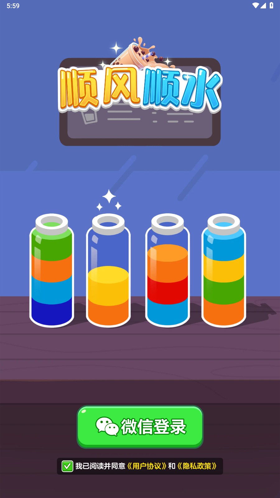 顺风顺水,倒水排序玩法的益智闯关游戏。每个关卡中会出现很多的瓶子,里面有着不同颜色的水,玩家需要将一样颜色的水成功倒入到一个瓶子之中,这样就能完成消除,后面的操作只要一样的话,分分钟就能实现过关,同时还有较多的福利等你领取。