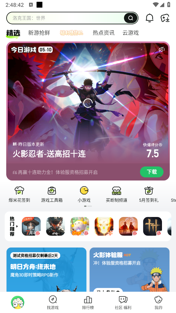 好游快爆最新版,超火的游戏平台,可以在里面抢先玩内侧的好游戏。从热门大作到小众精品,这里全都有。并且所有游戏都经过严格筛选,正版又安全,还可以在里面游戏社区查看攻略、视频、技巧等一应俱全,每日还能在里面领取道具卡。