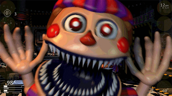 1、Freddy fazbear:出现于cam1,分四个阶段逐渐靠近,当他达到四阶段时关左门(a)防御,否则跳杀,温度越高,他移动越快(他必须开监控才能跳杀)
