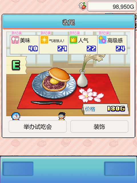 哆啦A梦的铜锣烧店物语是一款主打经营甜品店的像素风模拟经营游戏,玩法轻松休闲。游戏内有极其丰富的道具,包括加速制作的工具、提升口感的调料、吸引客流的装饰品等。通过百宝袋或完成任务,玩家可以获得稀有或特殊的材料,用于开发更高级的铜锣烧配方。游戏包含一定的社交元素,静香、胖虎、小夫等原作角色会光顾店铺,与他们互动能触发特殊事件。