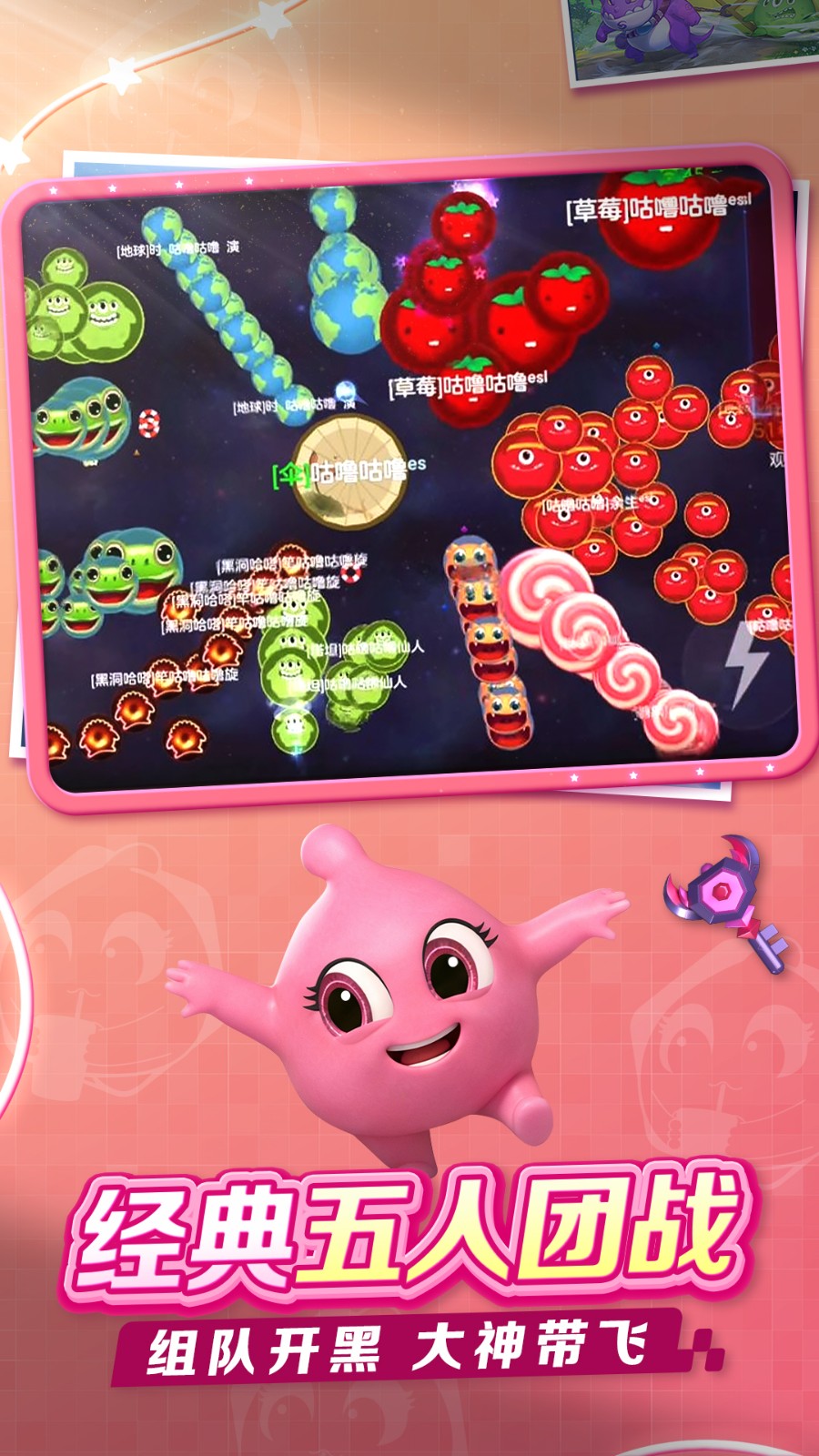 3、经典大团战模式,玩家在开放地图中自由对战,通过吞噬其他玩家不断成长,最终争夺排行榜第一的位置。