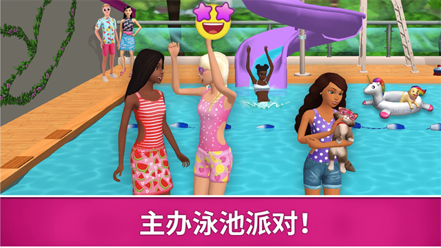 Dreamhouse芭比梦幻屋冒险是一款为芭比爱好者打造的3D装扮养成游戏,采用高品质3D引擎构建,呈现出明亮鲜艳的卡通绘画风格。游戏配有轻松愉快的背景音乐,打造超高自由度,玩家能够随心所欲地装扮芭比的整个梦幻屋,自由摆放和搭配各种风格的家具。玩家可以为芭比娃娃进行从头到脚的精细装扮,可以使用游戏内的相机功能,为精心装扮的芭比和布置好的房间拍摄创意照片。还可以进入厨房,体验烘焙烹饪的乐趣,也能让芭比在舞池中跟随音乐跳舞。