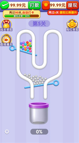 拉环高手,玩法上一直很解压的益智闯关游戏。玩家只要简单的移动拉环,那么就能让不同颜色的小球掉下来,只要顺利进入下面的桶中,并且要是闯关进度达到了百分之百后,那么就能直接过关,同时随时可以使用道具,也不用担心无法过关哦。
